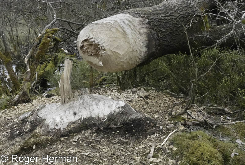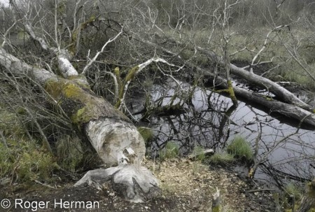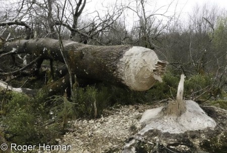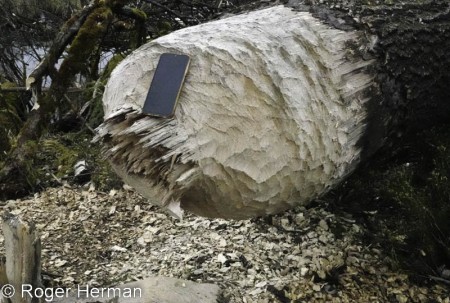 Ce tronc d’arbre d’une taille considérable (voir le cliché avec le GSM comme point de comparaison…) est tombé sous les dents des castors ! A n’en pas douter, des castors costauds et en nombre ! Cette curiosité est à voir en bordure de la piste qui, dans Puzen (Brackvenn), part du parking Nahsief (route Eupen – Montjoie). Ce chantier des castors, où l’on peut voir frênes, bouleaux, chênes abattus, se situe sur une des sources de la Getz (ou Getzbach), une des principales rivières qui alimentent le lac d’Eupen. La Getz fut parmi les premiers cours d’eau fagnards à accueillir des castors lors du retour dans notre région de ces étonnants rongeurs, il y a une cinquantaine d’années.